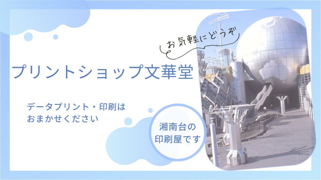 ホーム|プリントショップ文華堂 2024.02.262026.01.15 お知らせ お知らせ お知らせはありません 取扱商品 取扱商品 プリントショップ文華堂 営業時間 月~金曜日:10:00~18:00 休業日:土・日・祝日 住所 神奈川県藤沢市湘南台1-10-6 カルチャー湘南台ビル2F (湘南台駅東口H出口より徒歩2分・相鉄ローゼン隣) アクセス TEL:0466-42-5750 FAX:0466-42-5771 E-mail:psbunkado@yahoo.co.jp プリントショップ文華堂 営業時間 月~金曜日:10:00~18:00 休業日:土・日・祝日 住所 神奈川県藤沢市湘南台1-10-6 カルチャー湘南台ビル2F (湘南台駅東口H出口より徒歩2分・相鉄ローゼン隣)アクセス TEL:0466-42-5750 FAX:0466-42-5771 E-mail:psbunkado@yahoo.co.jp